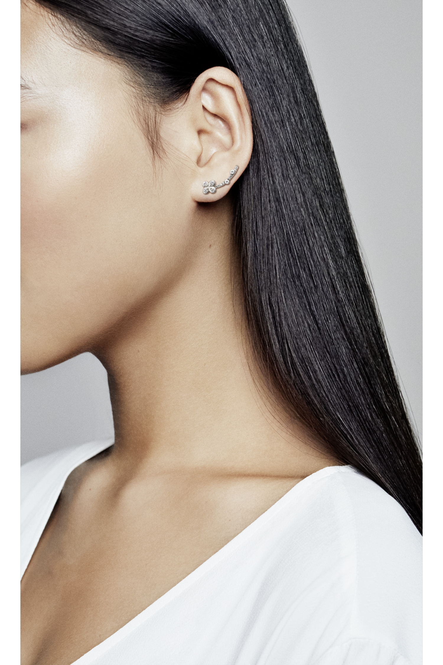 Pozwól naturze urozmaicić swój wygląd dzięki tym kolczykom, które zostały zaprojektowane tak aby podążać za naturalnym kształtem ucha. Wykonane ze srebra mają kształt kwiata wraz z łodygą, ozdobione dodatkowo błyszcząca przezroczystą cyrkonią.