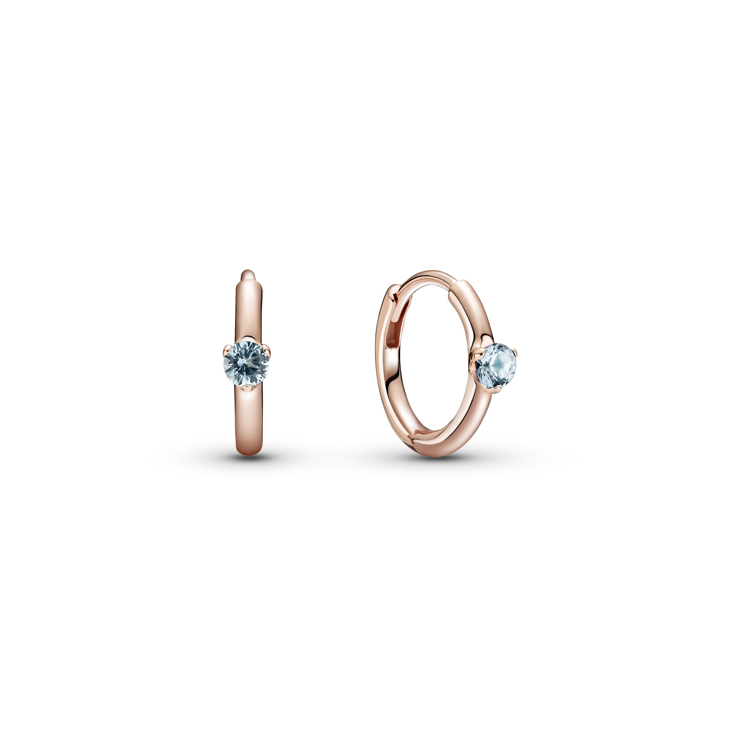 Te kolczyki koła typu huggie wykonane z Pandora Rose są opatrzone dwoma kryształami o szlifie brylantowym w kolorze błękitnym w oprawie claw z trzema łapkami nadającymi kompozycji lekkości.