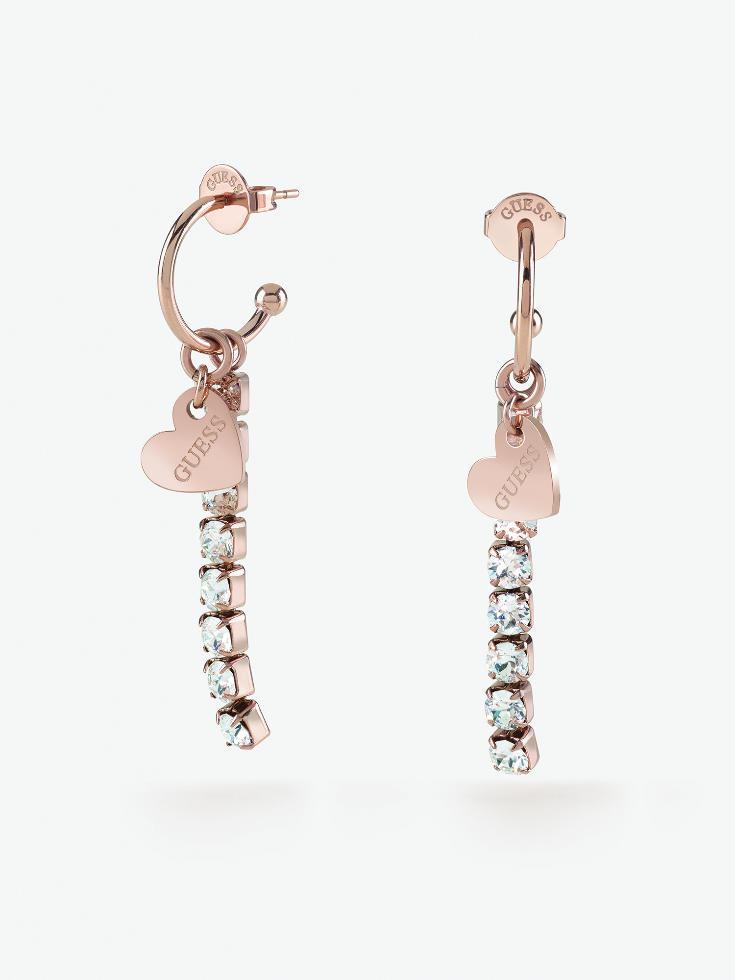 Kolczyki z wiszącym sercem z napisem “Guess” i pasmem wiszących pięknie oszlifowanych przezroczystych kryształaów Swarovskiego. Zapinane na dobrze podtrzymujący, estetyczny i niezauważalny sztyft. Wyprodukowane zostały z wysokiej jakości stali szlachetnej platerowanej różowym złotem.