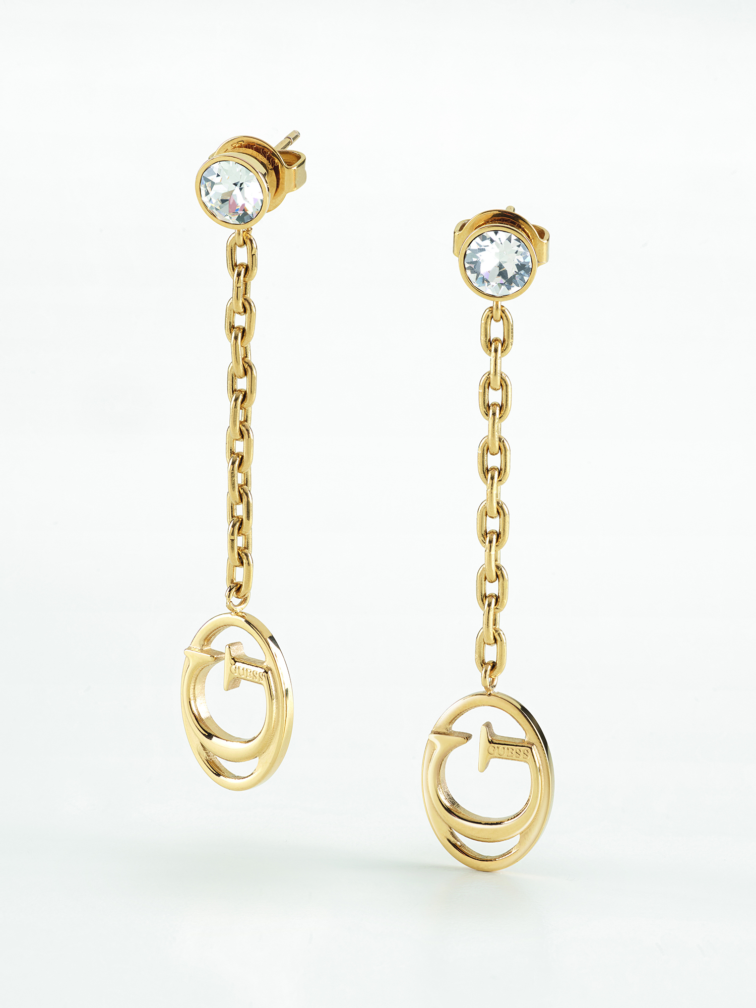 Wiszące kolczyki z logiem G ozdobione pięknie oszlifowanymi przezroczystymi kryształami Swarovskiego. Zapinane na dobrze podtrzymujący, estetyczny i niezauważalny sztyft. Wyprodukowane zostały z wysokiej jakości stali szlachetnej platerowanej żółtym złotem.