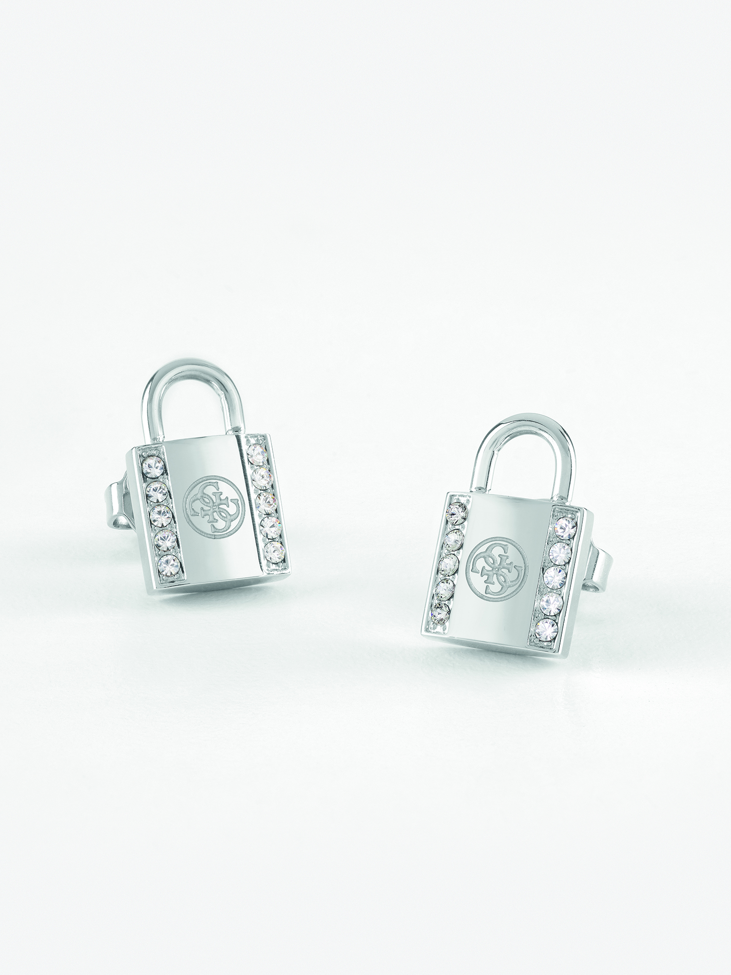 Kolczyki w kształcie kłódki ozdobionej pięknie oszlifowanymi przezroczystymi kryształami Swarovskiego, z wygrawerowanym logo Guess. Zapinane na dobrze podtrzymujący, estetyczny i niezauważalny sztyft. Wyprodukowane zostały z wysokiej jakości stali szlachetnej.