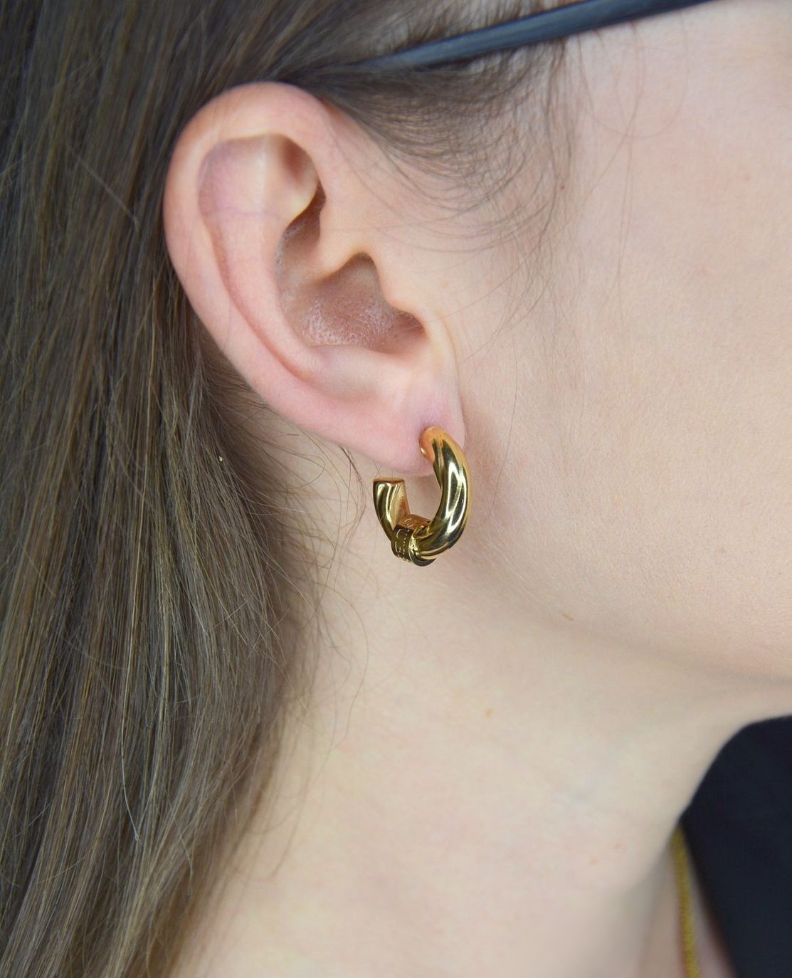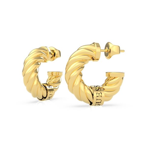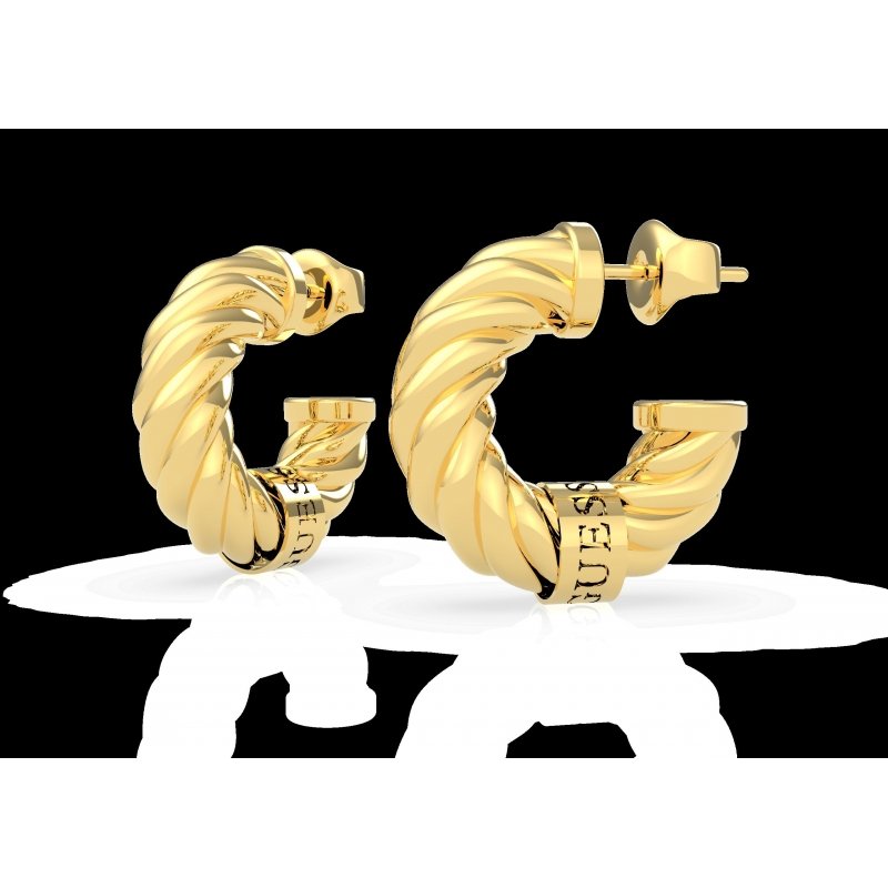 Kolczyki wiszące o unikalnym kształcie skręconego koła z pierścieniem, na którym wygrawerowano logo Guess. Zapinane na dobrze podtrzymujący, estetyczny i niezauważalny sztyft. Wyprodukowane zostały z wysokiej jakości stali szlachetnej platerowanej żółtym złotem dla luksusowego designu i wyższej odporności na uszkodzenia. Średnica produktu wynosi 20 mm.