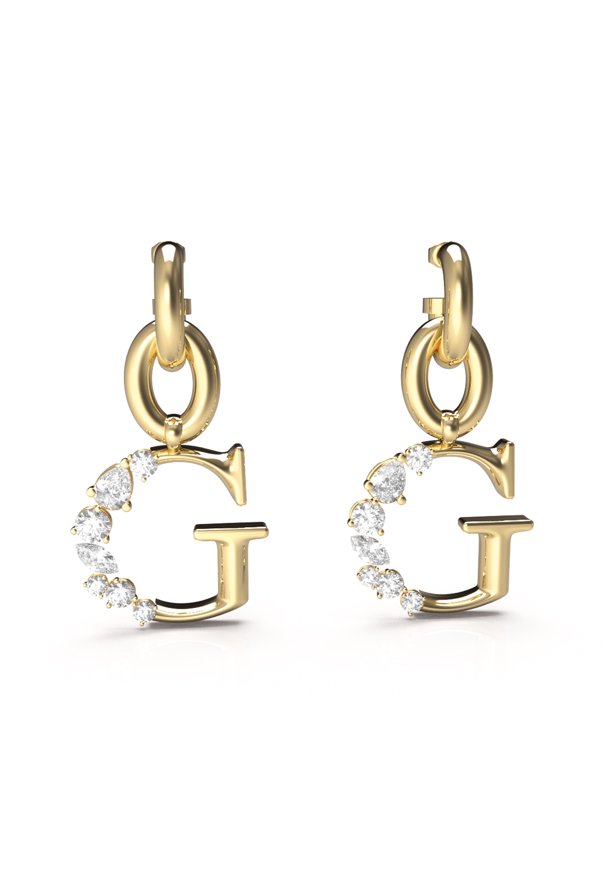 Wiszące kolczyki z logiem G ozdobione pięknie oszlifowanymi przezroczystymi kryształami Swarovskiego. Zapinane na dobrze podtrzymujący, estetyczny i niezauważalny sztyft. Wyprodukowane zostały z wysokiej jakości stali szlachetnej platerowanej żółtym złotem.