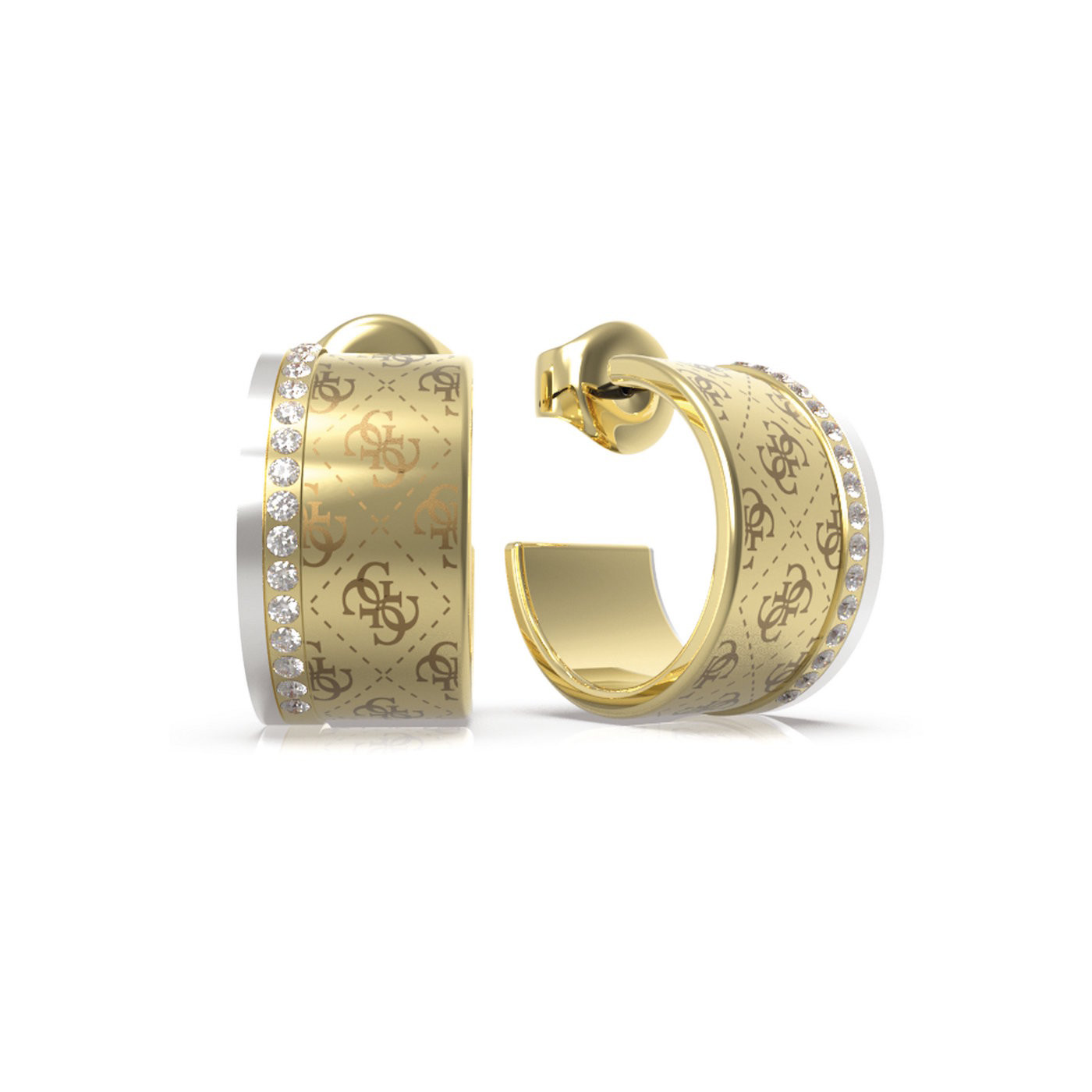 Wiszące kolczyki w kształcie otwartego koła z logiem 4G ozdobione pięknie oszlifowanymi przezroczystymi kryształkami Swarovskiego. Zapinane na dobrze podtrzymujący, estetyczny i niezauważalny sztyft. Wyprodukowane zostały z wysokiej jakości stali szlachetnej platerowanej żółtym złotem.
