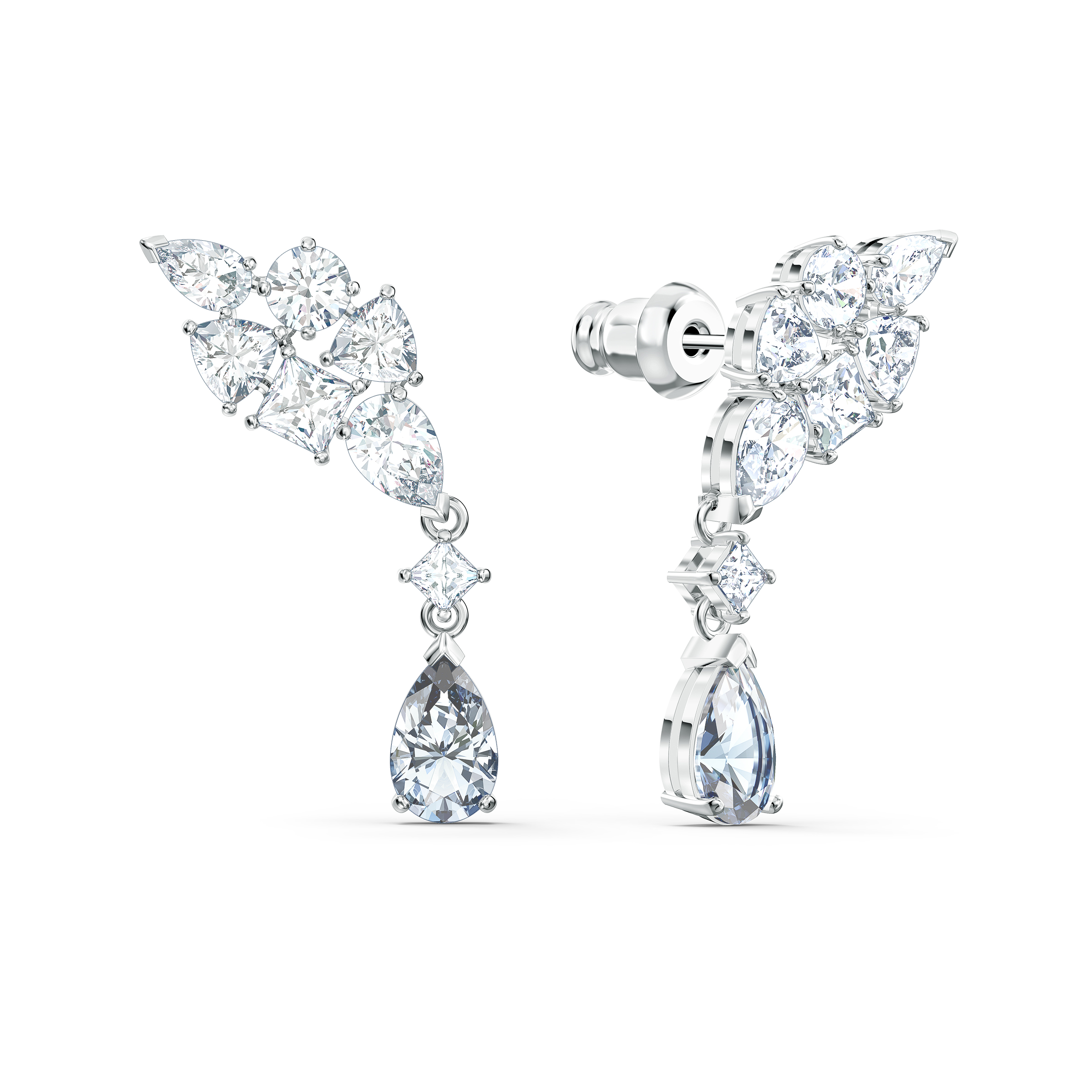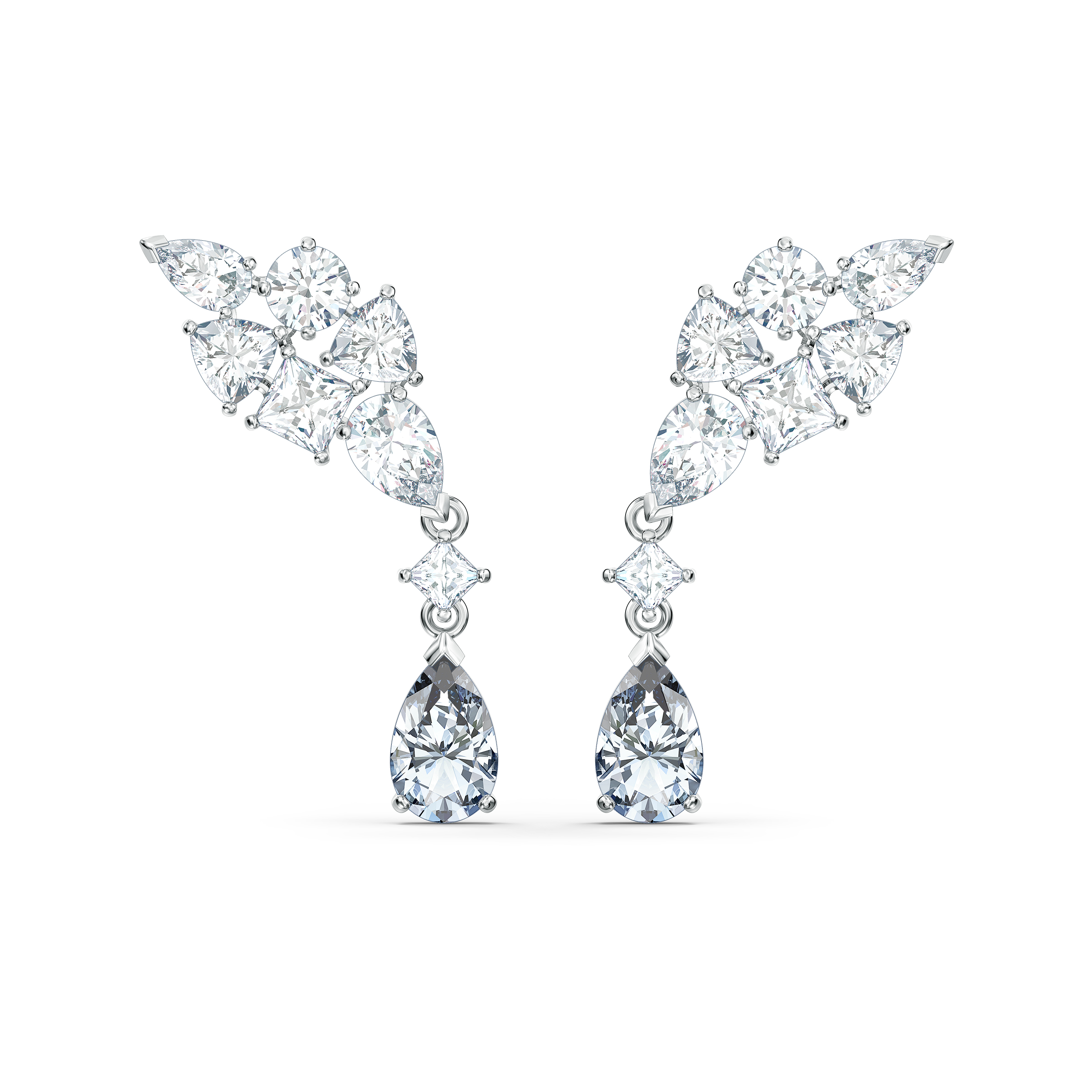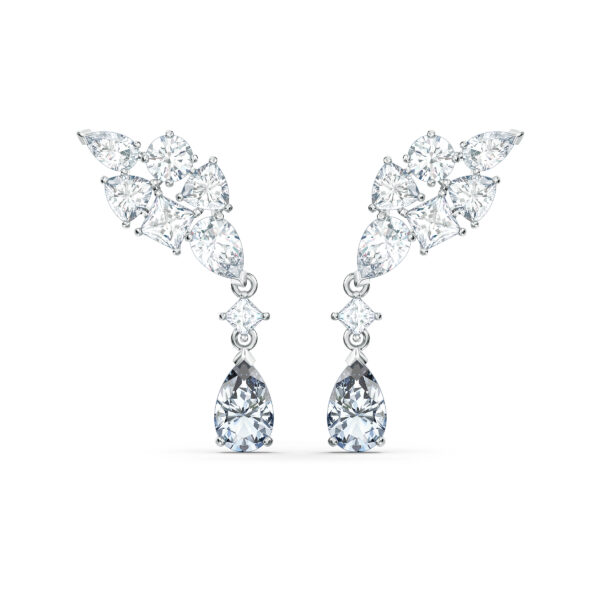 Cudowne kolczyki Swarovskiego — ponadczasowy model olśniewający blaskiem. Zostały ozdobione mistrzowsko wykrojonymi białymi kamieniami o różnorodnych formach — od kuli, przez kroplę, po owalne, kwadratowe i trójkątne szlify. Efektowne kamienie w kształcie kropli dopełniają wiszące kamienie o kwadratowym szlifie i subtelnym szarym odcieniu. Kolczyki łatwo dopasować do innych modeli biżuterii. Dodadzą elegancji każdej stylizacji.