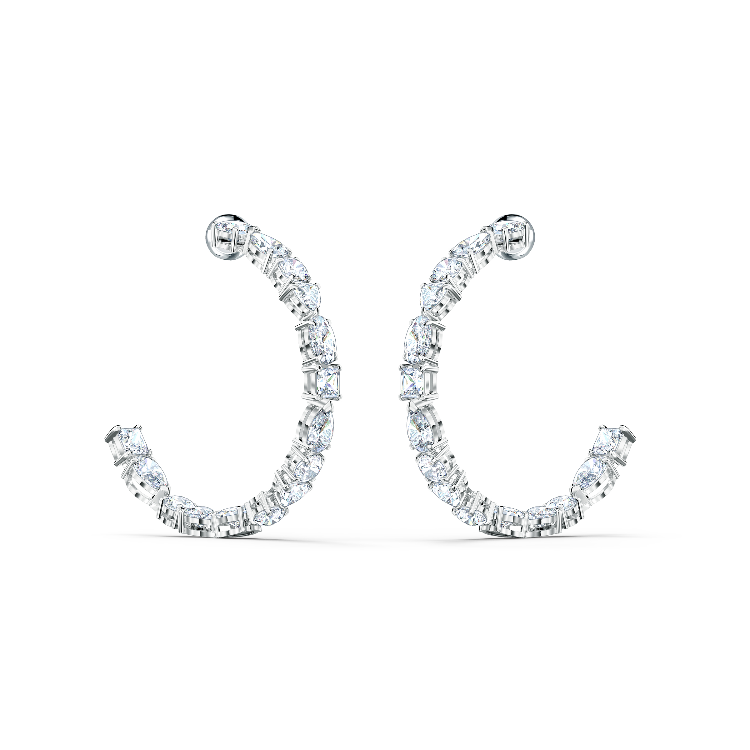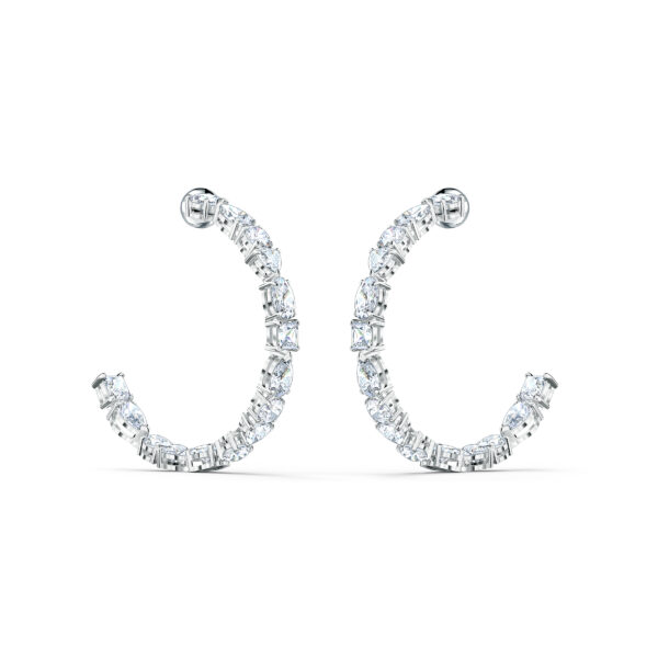 Kolczyki Swarovskiego o prostej formie i wyrafinowanej elegancji. Koła tworzą pasma lśniących białych kamieni o mistrzowskim szlifie w różnorodnych formach — od kuli, przez kroplę, po kwadrat i trójkąt. Ponadczasowy dodatek do codziennych stylizacji, który łatwo dopasować do innych modeli biżuterii. Pomysł na piękny prezent.