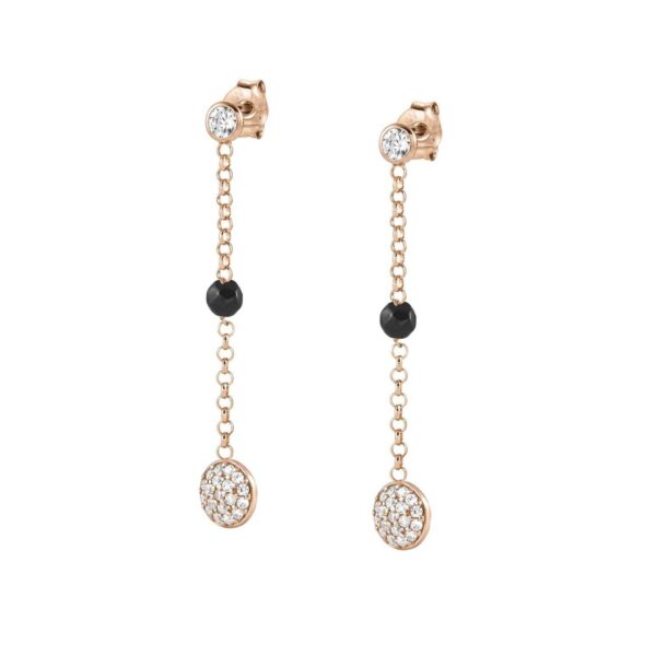 Oryginalne kolczyki wiszące renomowanej firmy Nomination, wykonane ze srebra próby 925,pokryte 22k różowym złotem. Kolczyki zdobione czarnym jadeitem i kółkiem z cyrkoniami.