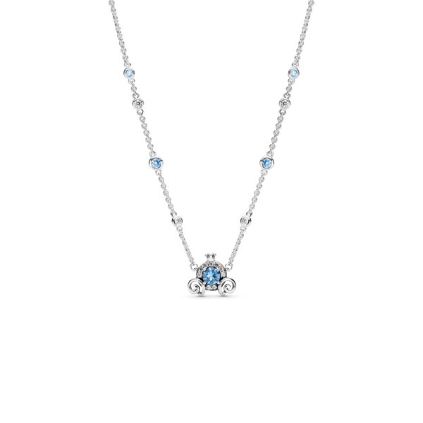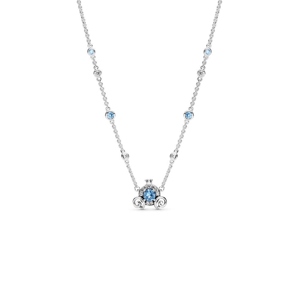 Celebruj 70. urodziny legendarnej bajki z kolią Disney, Karoca Kopciuszka. Srebrna, ręcznie wykończona kolia z karocą z dyni zachwyca położonym centralnie niebieskim kamieniem otoczonym przezroczystymi, sześciennymi cyrkoniami, trójwymiarową koroną oraz liśćmi zdobiącymi koła. Większe kamienie zostały umieszczone wzdłuż regulowanego łańcuszka z pantofelkiem Kopciuszka, a z zapięcia zwisa monogram Pandora O z koroną. Zestaw ją ze srebrnymi kolczykami, aby uzyskać subtelny, magiczny wygląd.