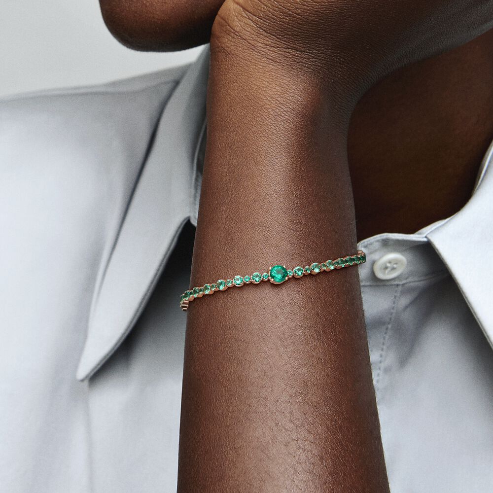 Każda stylizacja nabierze dzięki niej eleganckiego charakteru. Ta bransoletka tenisowa z unikalnego stopu metali platerowanego 14-karatowym różowym złotem skrzy się blaskiem ciemnozielonych kryształów syntetycznych. Kamienie o różnej wielkości układają się w pasmo pavé, którego centralną ozdobą jest większy, okrągły kamień. Zapięcie karabińczykowe zapobiega zgubieniu bransoletki i umożliwia wybór jednej z trzech długości. Połącz ją z inną olśniewającą biżuterią Pandora w klasyczną kompozycję.