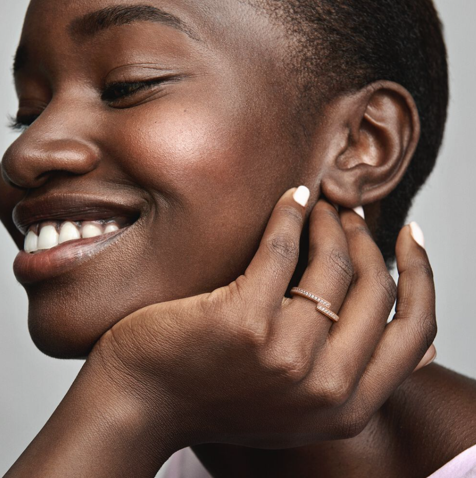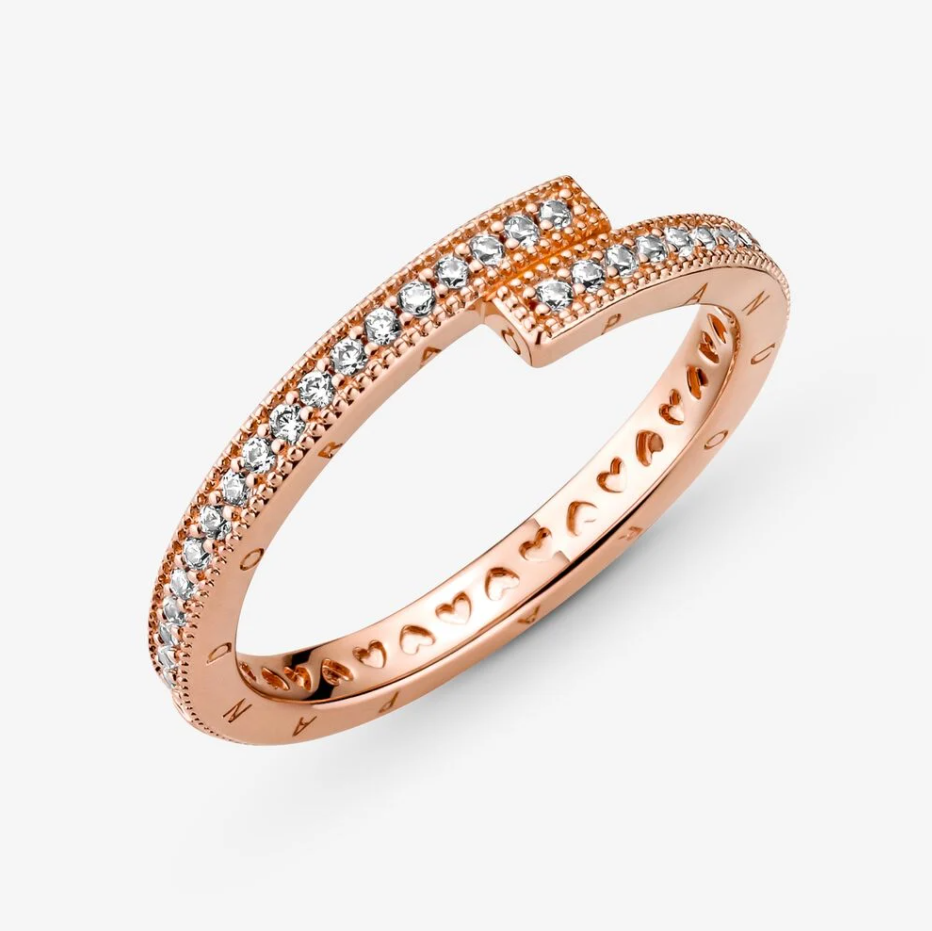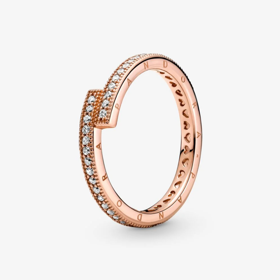 Oto współczesny minimalizm w ozdobnym wydaniu. Ten asymetryczny pierścionek platerowany 14-karatowym różowym złotem został wykończony ręcznie, a kwadratowe końcówki obrączki zachodzą lekko na siebie, tworząc po bokach kąty proste. Jego górna część jest wysadzana przezroczystymi cyrkoniami sześciennymi pavé w obramowaniu mikrogranulacji, po bokach biegnie logo Pandora, a wewnątrz widać pasmo serc cut-out. Końcówka każdego pasma została ozdobiona monogramem Pandora z O w koronie. Subtelnie spektakularny solo, wygląda też zjawiskowo w zestawie – jakkolwiek postanowisz go nosić, zawsze będzie porywająco pięknym dodatkiem.