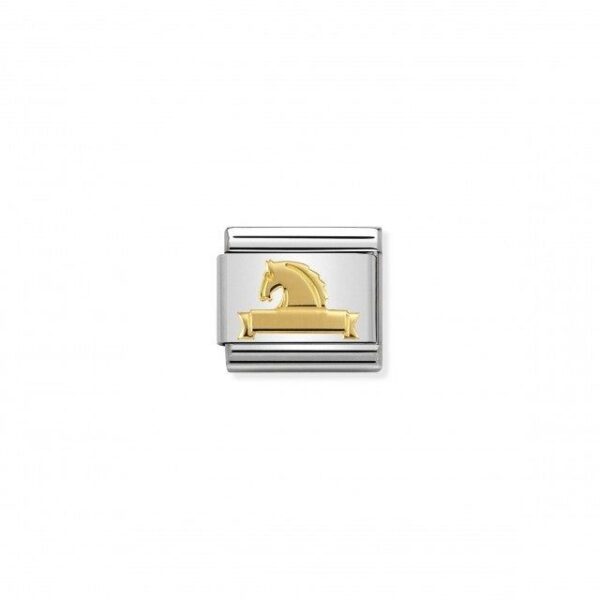 Oryginalny element do bransoletki komponowanej Nomination Composable Classic ze stali szlachetnej z popiersiem konia ze wstęgą z 18-karatowego złota.