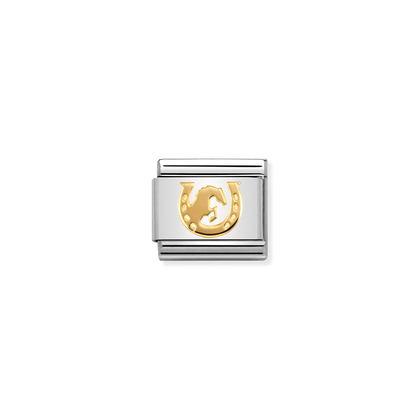 Oryginalny element do bransoletki komponowanej Nomination Composable Classic ze skaczącym koniem w podkowie z 18-karatowego złota.