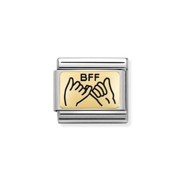 Oryginalny element do bransoletki komponowanej Nomination Composable Classic ze stali szlachetnej z połączonymi dłońmi i napisem BFF z 18-karatowego złota.