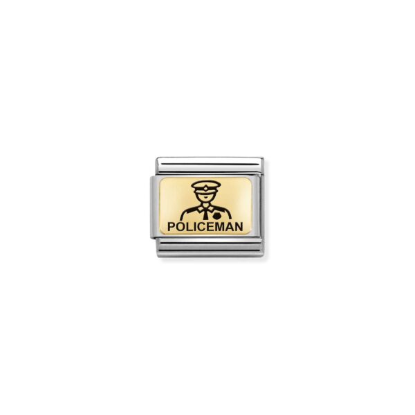 Oryginalny moduł do bransoletki komponowanej Nomination Composable Classic ze stali szlachetnej z blaszką z 18-karatowego złota i wygrawerowaną postacią policjanta oraz napisem “POLICEMAN”.