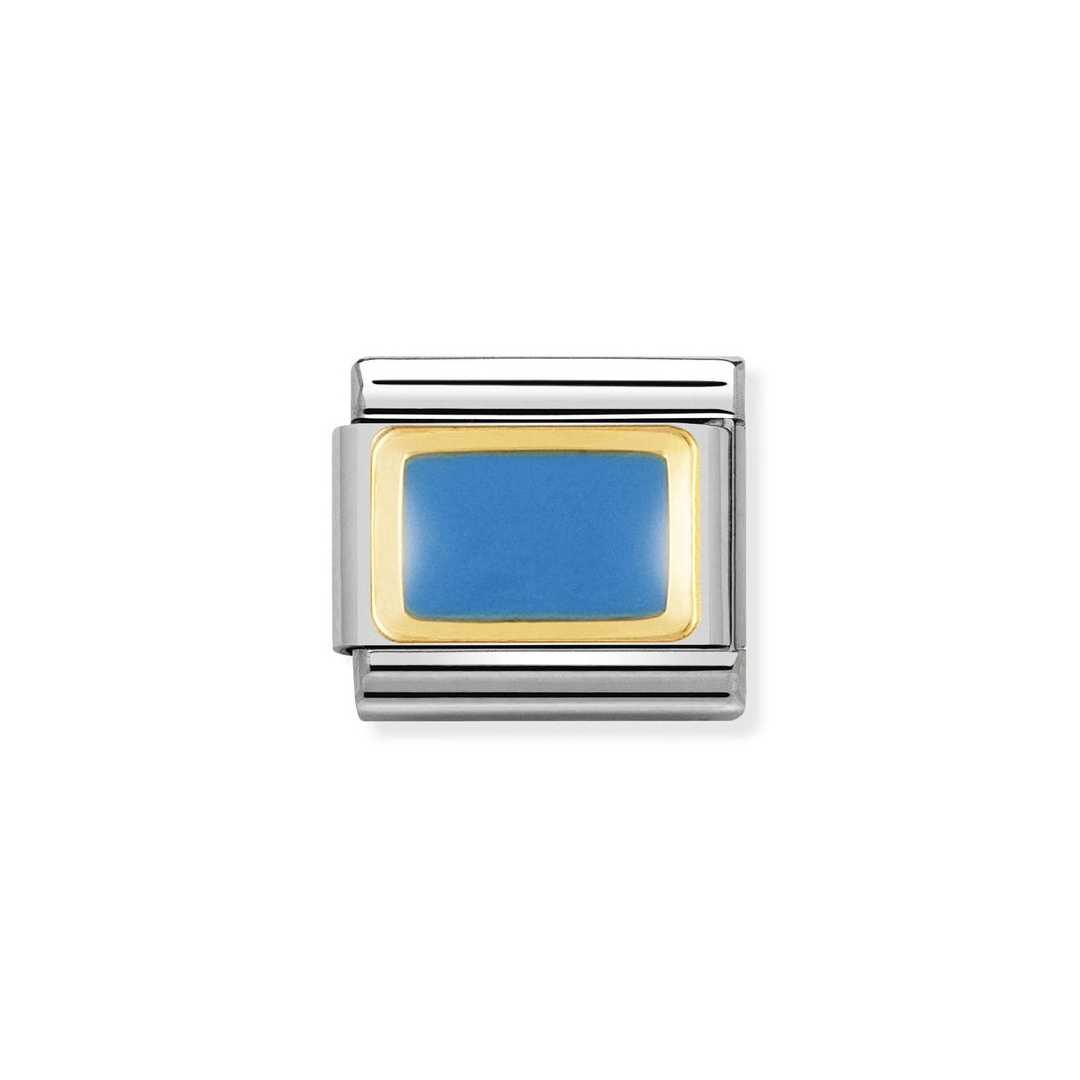 Moduł do klasycznej komponowanej bransoletki Nomination wykonany ze stali szlachetnej z błękitnym emaliowanym prostokątem którego krawędzie wykończone są z 18-karatowego złota.