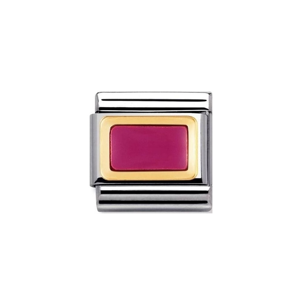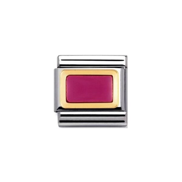 Moduł do klasycznej komponowanej bransoletki Nomination wykonany ze stali szlachetnej z fuksjowym emaliowanym prostokątem którego krawędzie wykończone są z 18-karatowego złota.