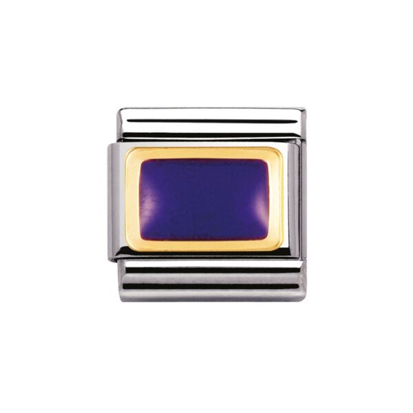 Moduł do klasycznej komponowanej bransoletki Nomination wykonany ze stali szlachetnej z granatowym emaliowanym prostokątem którego krawędzie wykończone są z 18-karatowego złota.