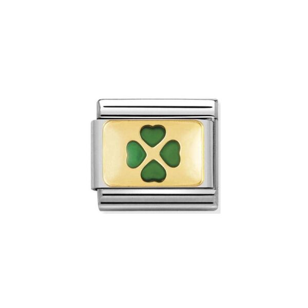 Oryginalny element do bransoletki komponowanej Nomination Composable Classic ze stali szlachetnej z symbolem zielonej koniczyny z 18-karatowego złota i emalią.