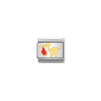 Oryginalny element do bransoletki komponowanej Nomination Composable Classic z motywem bociana z różowym zawiniątkiem z 18-karatowego złota i emalii.