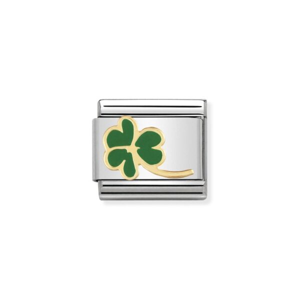 Oryginalny element do bransoletki komponowanej Nomination Composable Classic ze stali szlachetnej z symbolem zielonej koniczyny z 18-karatowego złota i emalią.