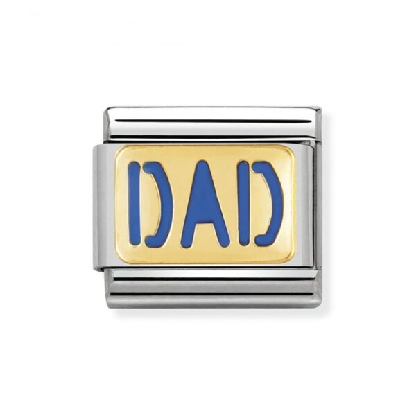 Oryginalny element do bransoletki komponowanej Nomination Composable Classic ze stali szlachetnej z napisem DAD – tata w kolorze niebieskim z 18-karatowego złota i emalią.
