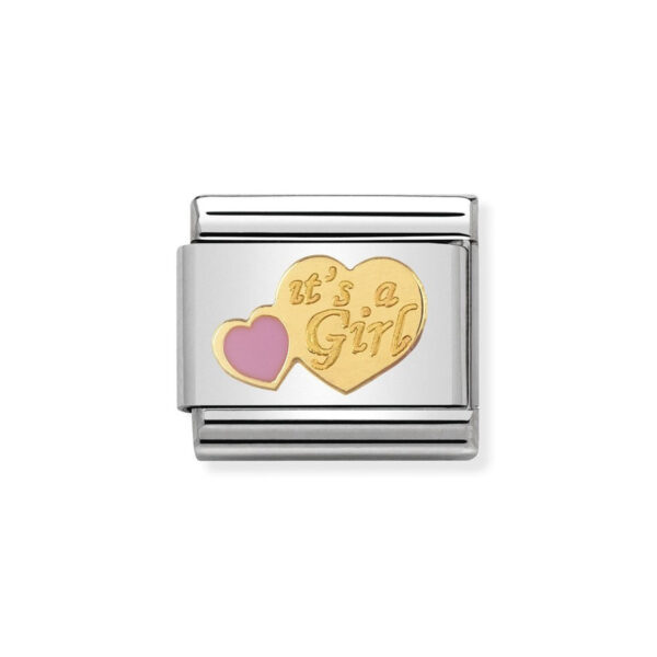 Oryginalny element do bransoletki komponowanej Nomination Composable Classic ze stali szlachetnej z napisem “It’s a Girl” – to dziewczynka z 18-karatowego złota i emalią.
