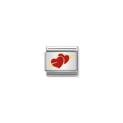 Stylowy moduł do klasycznej komponowanej bransoletki Nomination wykonany ze stali szlachetnej z motywem złączonych serc przebitych strzałą z emalii i 18-karatowego złota.