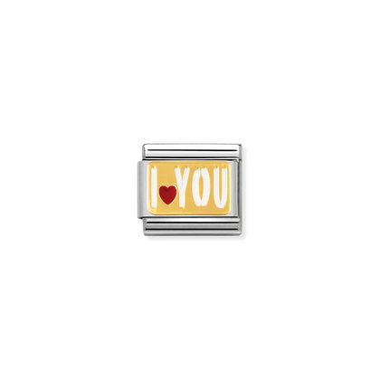 Stylowy moduł do klasycznej komponowanej bransoletki Nomination wykonany ze stali szlachetnej z napisem “I <3 YOU” z 18-karatowego złota i czarnej emalii.