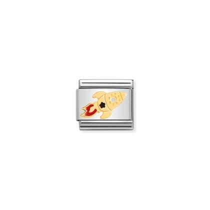 Moduł do klasycznej komponowanej bransoletki Nomination wykonany ze stali szlachetnej z rakietą z 18-karatowego złota i kolorowej emalii.
