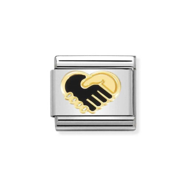 Oryginalny element do bransoletki komponowanej Nomination Composable Classic ze stali szlachetnej z symbolem uścisku dłoni w kształcie serca z 18-karatowego złota i emalią.