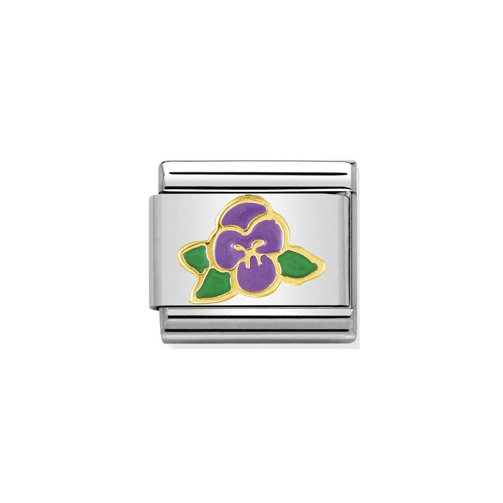 Oryginalny element do bransoletki komponowanej Nomination Composable Classic ze stali szlachetnej z bratkiem z 18-karatowego złota i emalią.