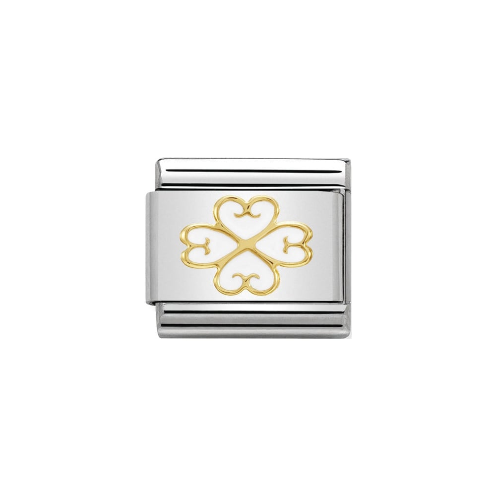 Moduł do klasycznej komponowanej bransoletki Nomination wykonany ze stali szlachetnej z czterema białymi sercami z 18-karatowego złota i białej emalii.