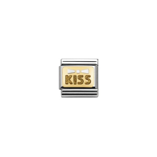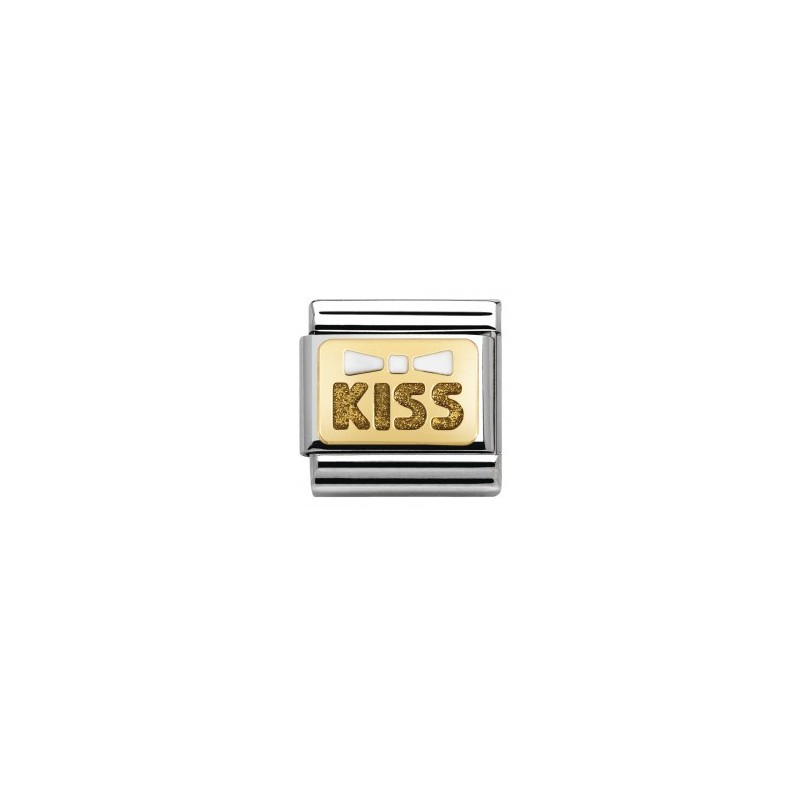 Oryginalny element do bransoletki komponowanej Nomination Composable Classic ze stali szlachetnej z muszką i napisem “Kiss” z 18-karatowego złota z brokatem i białą emalią. Link z kolekcji „Glitter Nights”.