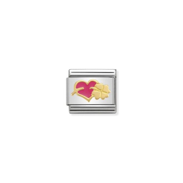 Moduł do klasycznej komponowanej bransoletki Nomination wykonany ze stali szlachetnej z różowym sercem z koniczyną z 18-karatowego złota i emalii.