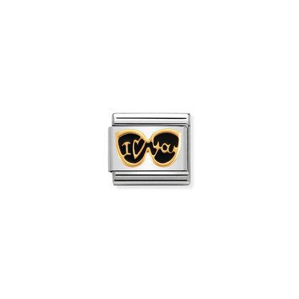 Moduł do klasycznej komponowanej bransoletki Nomination wykonany ze stali szlachetnej z okularami i napisem “I <3 YOU” z 18-karatowego złota i czarnej emalii.