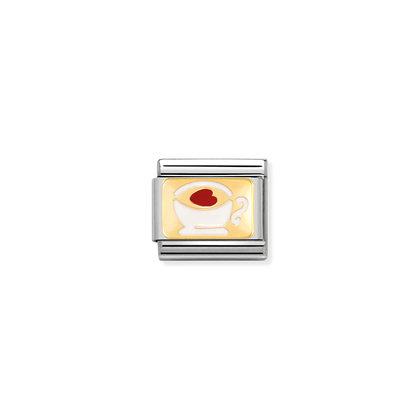 Moduł do klasycznej komponowanej bransoletki Nomination wykonany ze stali szlachetnej z filiżanką kawy i sercem z 18-karatowego złota i emalii.