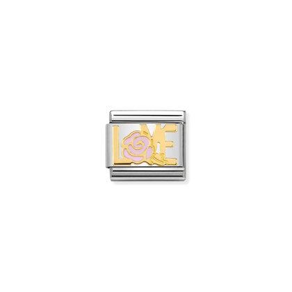 Moduł do klasycznej komponowanej bransoletki Nomination wykonany ze stali szlachetnej z napisem “LOVE” i różową różą z 18-karatowego złota i emalii.