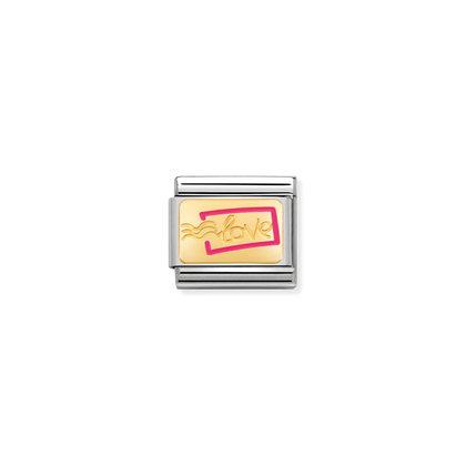 Moduł do klasycznej komponowanej bransoletki Nomination wykonany ze stali szlachetnej ze znaczkiem pocztowym z napisem “LOVE” z 18-karatowego złota i emalii.