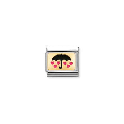 Moduł do klasycznej komponowanej bransoletki Nomination wykonany ze stali szlachetnej z parasolką i “kroplami” serduszek z 18-karatowego złota i emalii.