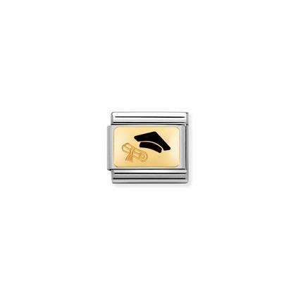 Moduł do klasycznej komponowanej bransoletki Nomination wykonany ze stali szlachetnej z dyplomem i czapką absolwenta z 18-karatowego złota i emalii.