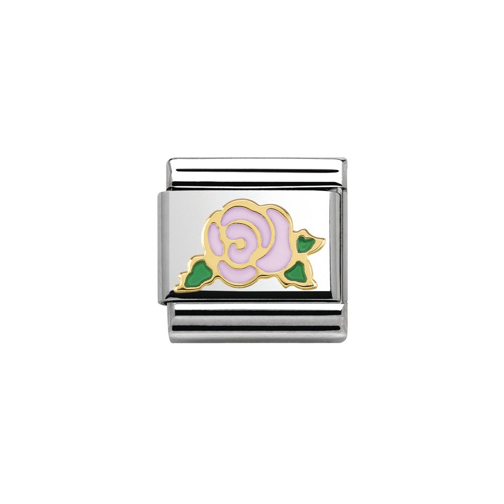 Moduł do klasycznej komponowanej bransoletki Nomination wykonany ze stali szlachetnej z różową różą z 18-karatowego złota i emalii.