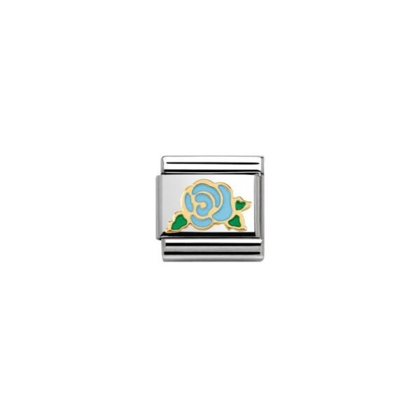 Moduł do klasycznej komponowanej bransoletki Nomination wykonany ze stali szlachetnej z niebieską różą z 18-karatowego złota i emalii.