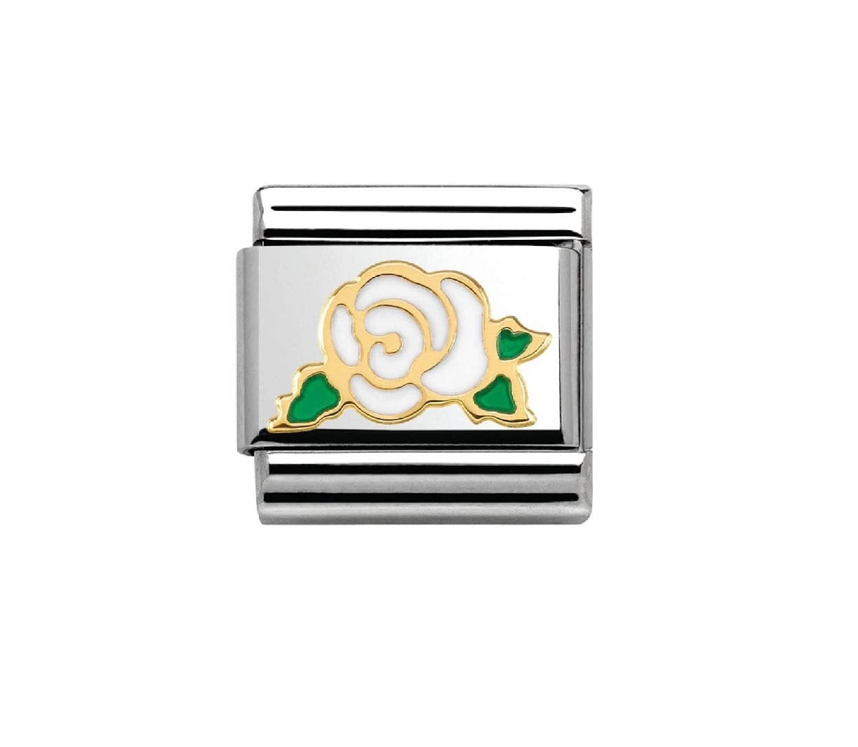 Moduł do klasycznej komponowanej bransoletki Nomination wykonany ze stali szlachetnej z białą różą z 18-karatowego złota i emalii.