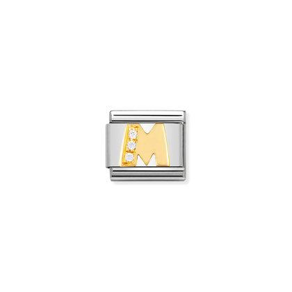 Moduł do klasycznej komponowanej bransoletki Nomination wykonany ze stali szlachetnej z literą “M” z cyrkoniami sześciennymi z 18-karatowego złota i emalii.