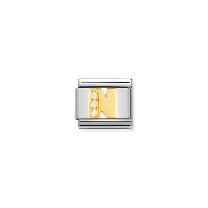 Moduł do klasycznej komponowanej bransoletki Nomination wykonany ze stali szlachetnej z literą “N” z cyrkoniami sześciennymi z 18-karatowego złota i emalii.
