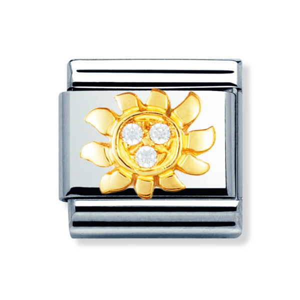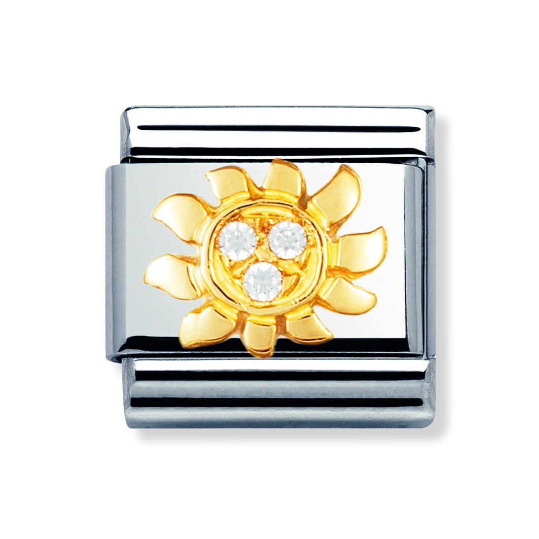 Moduł do klasycznej komponowanej bransoletki Nomination wykonany ze stali szlachetnej ze słońcem z cyrkoniami sześciennymi z 18-karatowego złota.