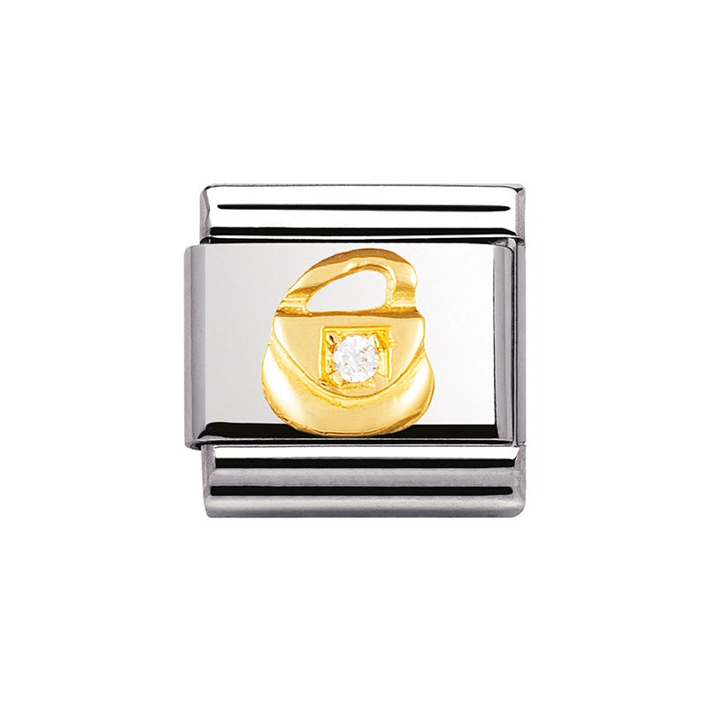 Moduł do klasycznej komponowanej bransoletki Nomination wykonany ze stali szlachetnej z torebką z cyrkoniami sześciennymi z 18-karatowego złota.