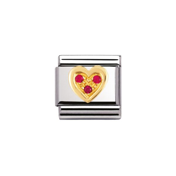 Moduł do klasycznej komponowanej bransoletki Nomination wykonany ze stali szlachetnej z serce z czerwonymi cyrkoniami sześciennymi z 18-karatowego złota.