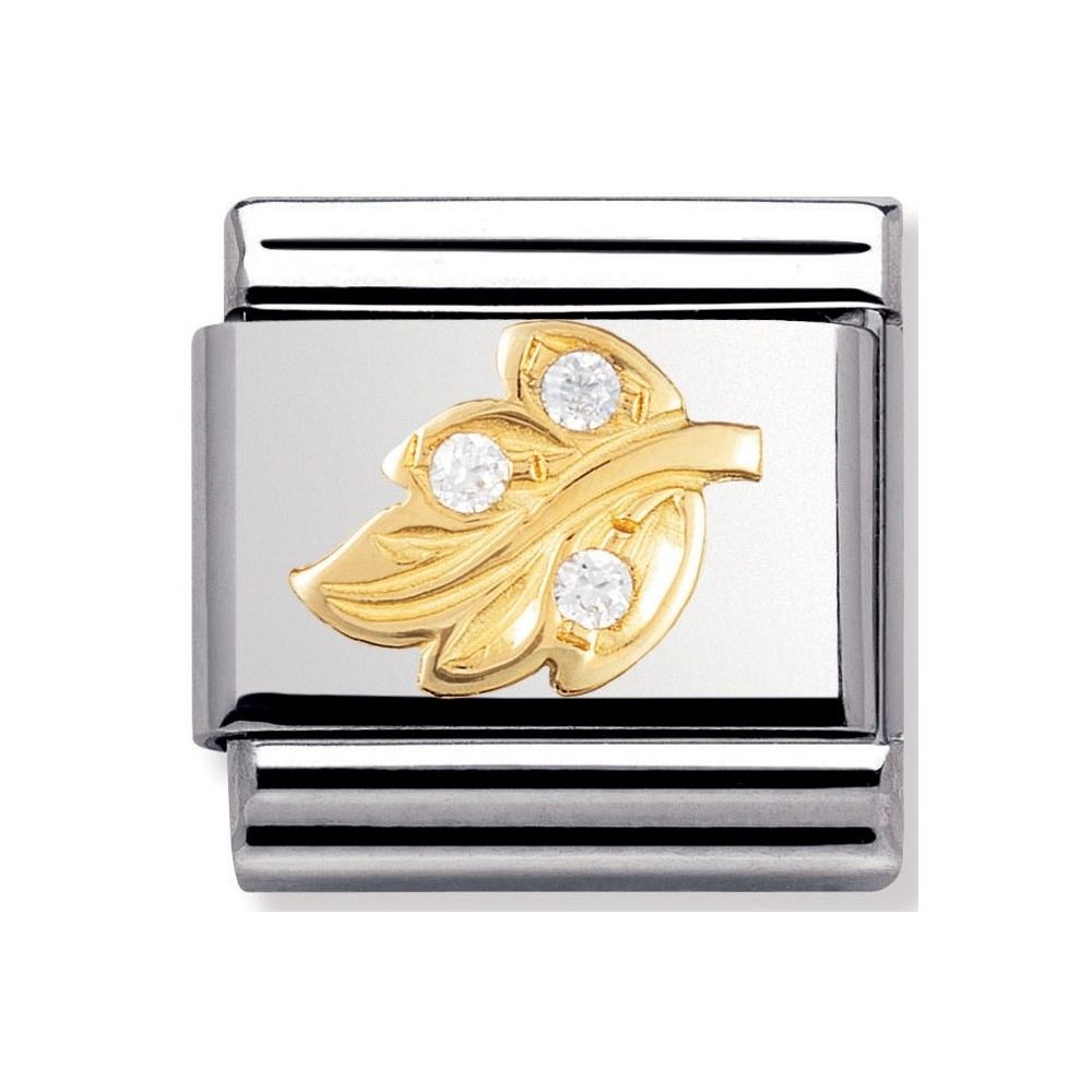 Moduł do klasycznej komponowanej bransoletki Nomination wykonany ze stali szlachetnej z liściem z cyrkoniami sześciennymi z 18-karatowego złota.