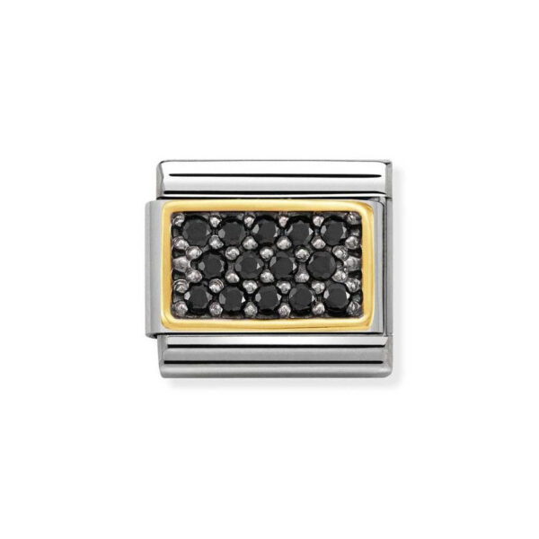 Moduł do klasycznej komponowanej bransoletki Nomination wykonany ze stali szlachetnej z blaszką z 18-karatowego złota i czarnymi cyrkoniami sześciennymi.